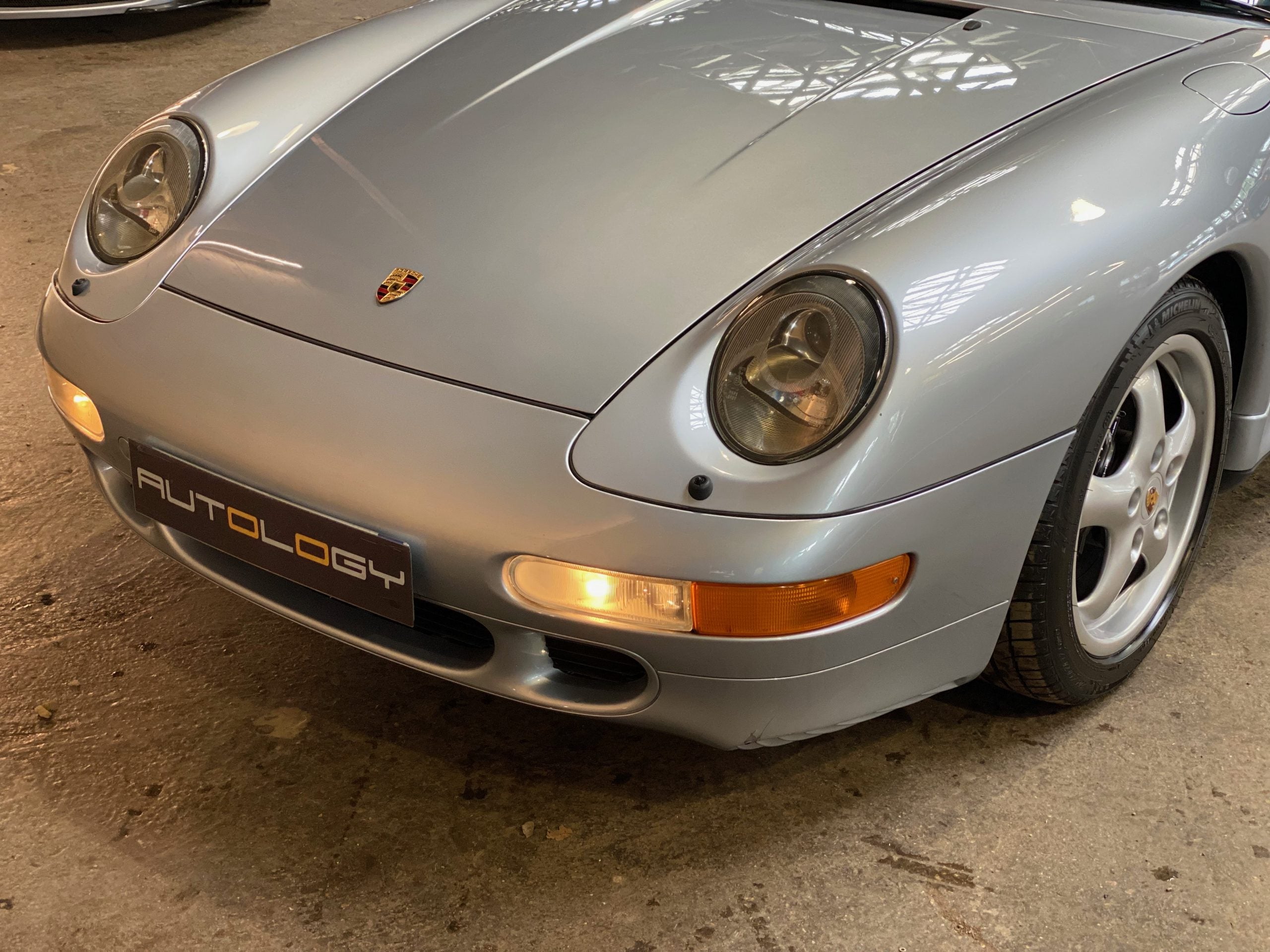 A cette date, subsiste encore quelques Porsche 993 disponibles en concession.... dernières du genre. On est alors loin de s'imaginer que 25 ans plus tard, celles-ci susciteront un tel engouement. La 993 constitue en effet pour beaucoup un certain achèvement de la lignée 911. Tous les attributs caractéristiques de cette auto légendaire y sont regroupés : le 6 cylindres à plat refroidi par air (dont la puissance avait été portée à 285ch sur notre version Varioram), les cinq compteurs disposés côte à côte, la clé de contact à gauche, des ajustements parfaits, des matériaux de grande qualité, et le tout sans fioritures. Notre rare version Carrera S (3.714 exemplaires sur 68.800 Porsche 993) y ajoute ce que d'aucuns considèrent comme un accomplissement esthétique, le "Turbo Look Usine". Voies élargies et caisse large, pare-chocs et bas de caisse redessinés, le tout sans aileron fixe; la ligne de la 911 est alors magnifiée, sublimée. La Carrera S est en outre l'unique version de 993 se singularisant par un aileron mobile à double grilles.